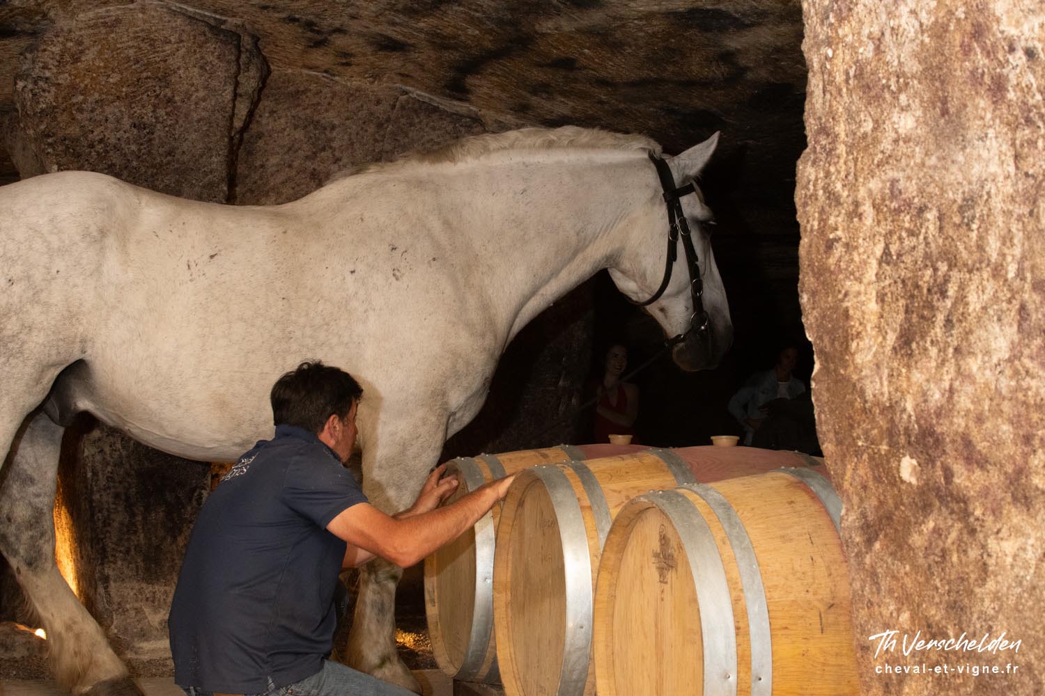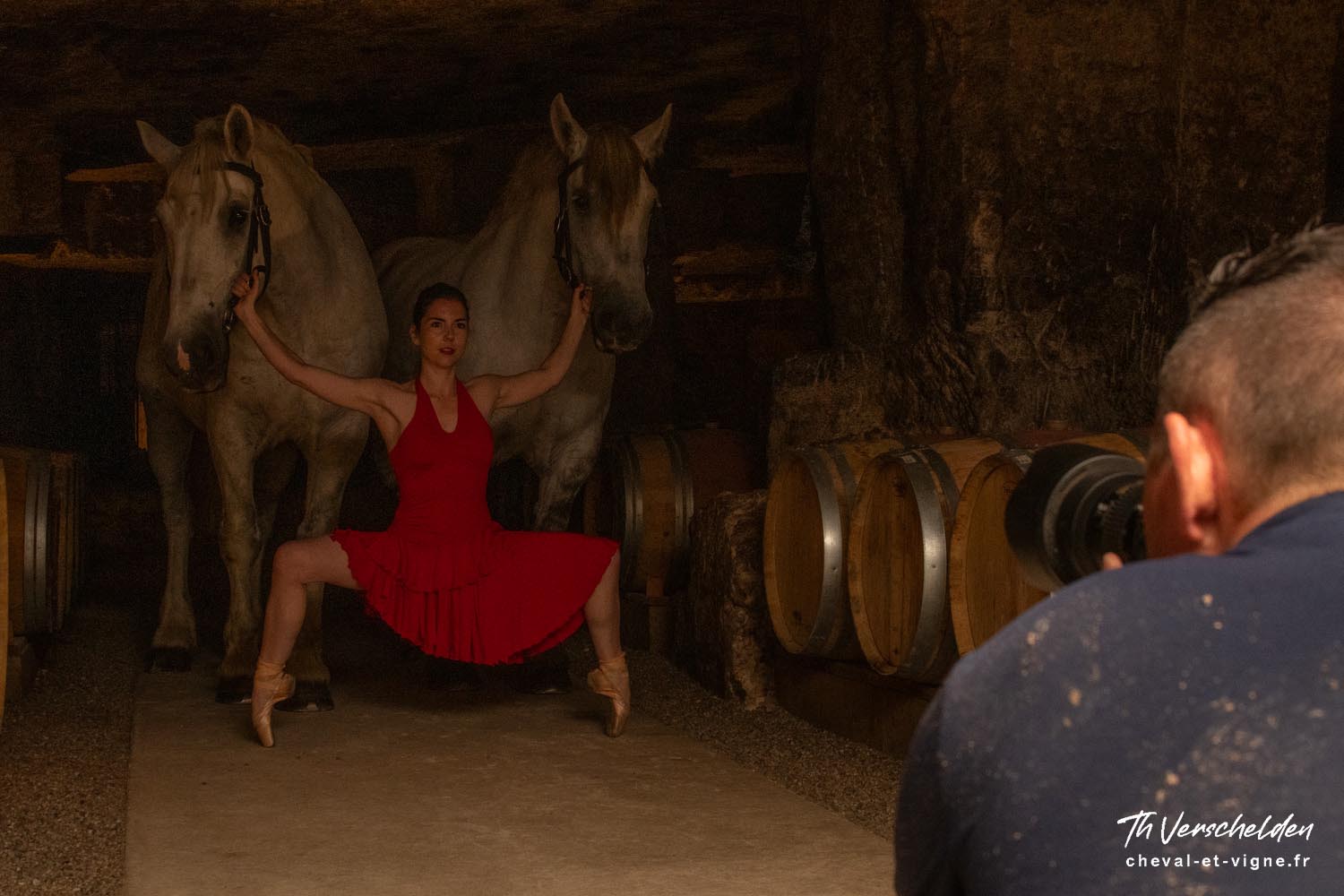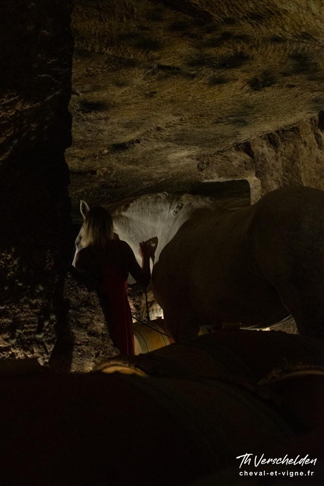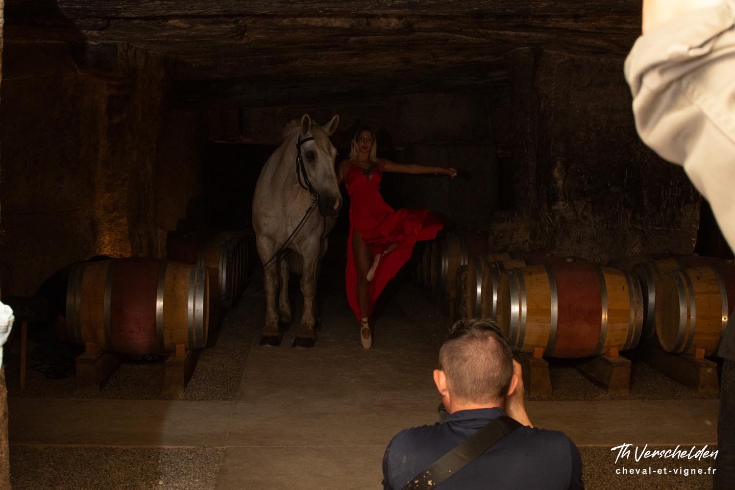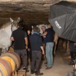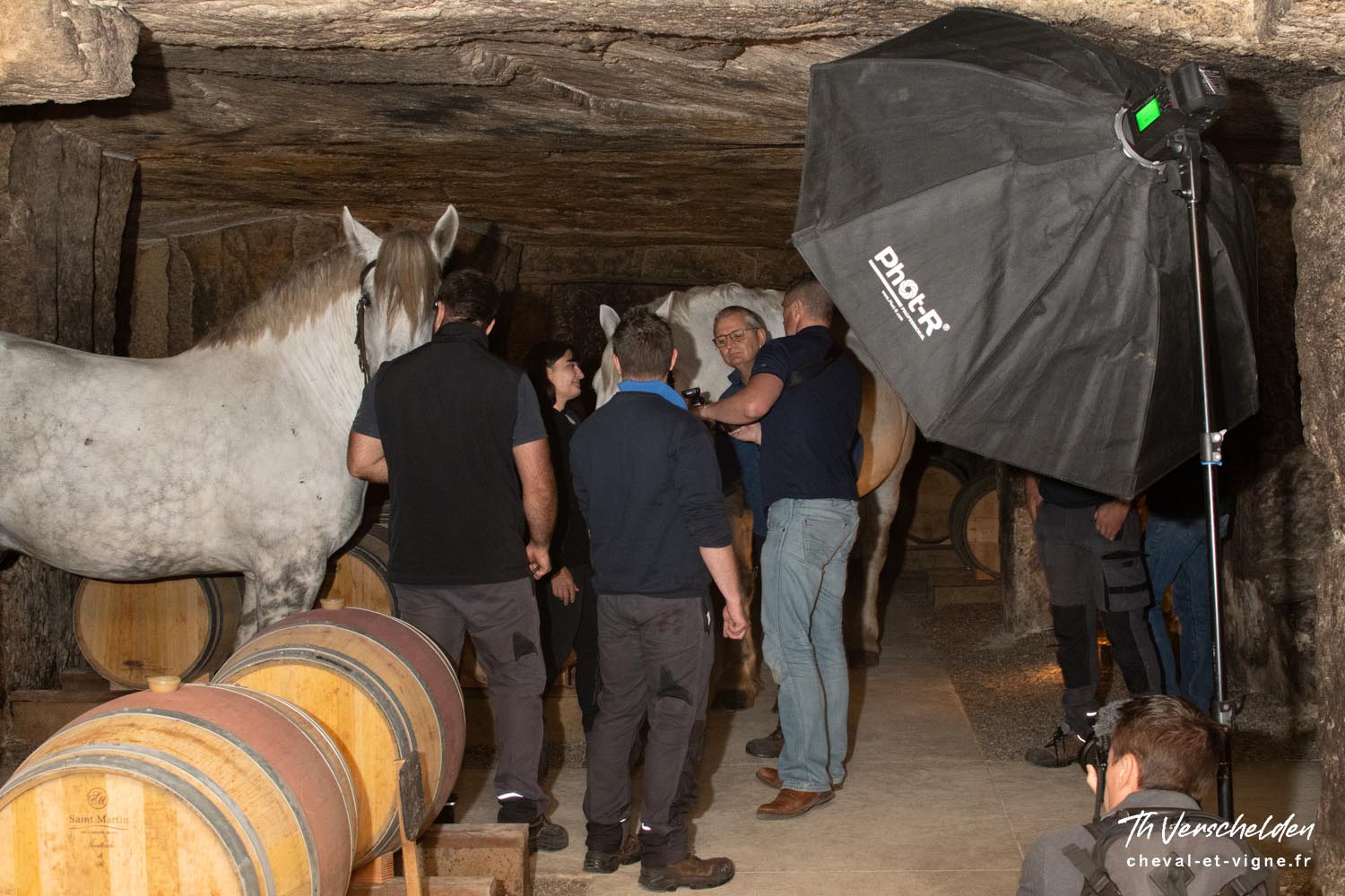 Face au château, dans les entrailles de la colline, le troglodytique chai à barriques (et amphores) a servi de décor à une séance photo de Franck Simon (GraindePixel) commencée dans le cuvier du château Canon et terminée entre les machines avec le personnel qui partage habituellement les rangs avec les chevaux.