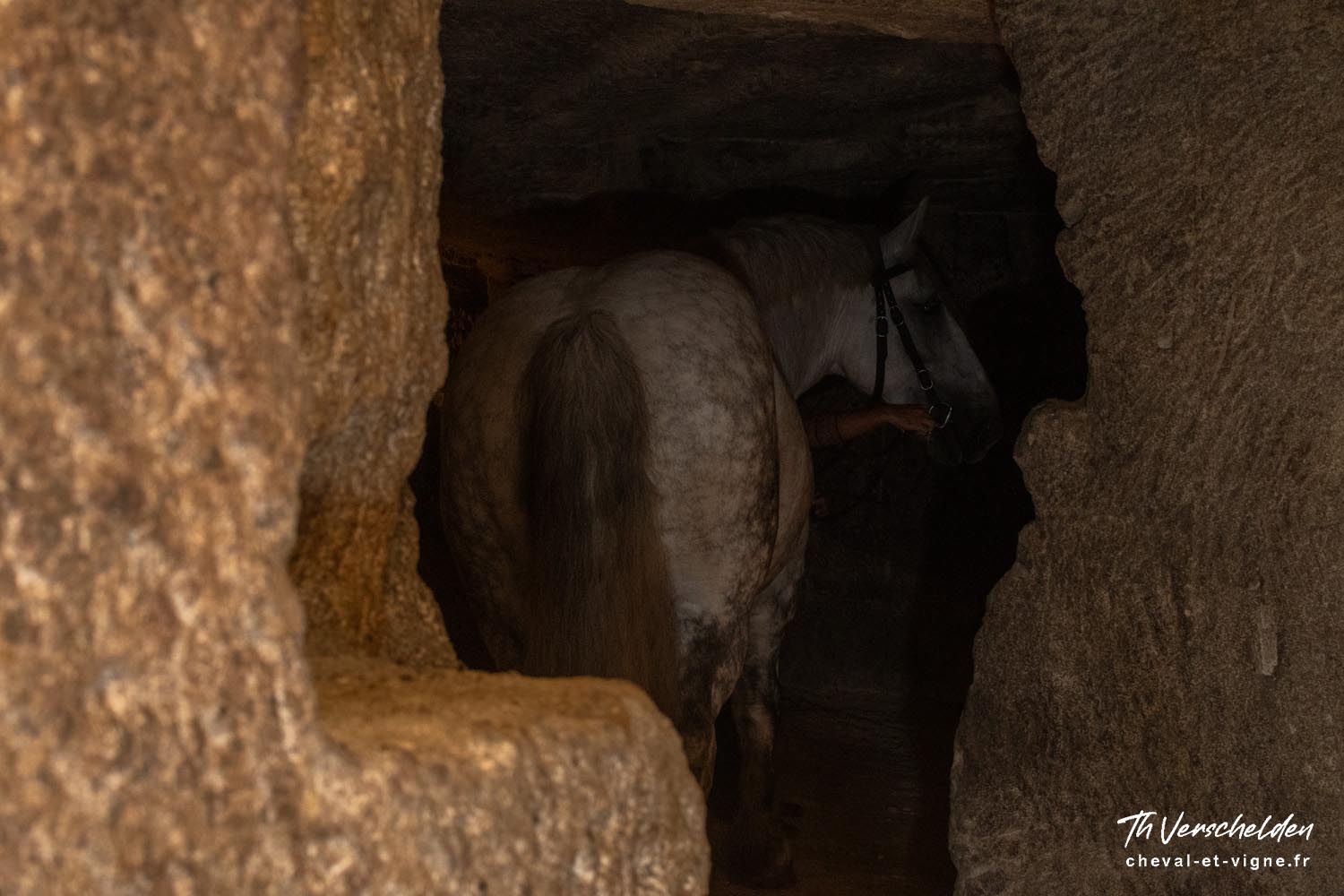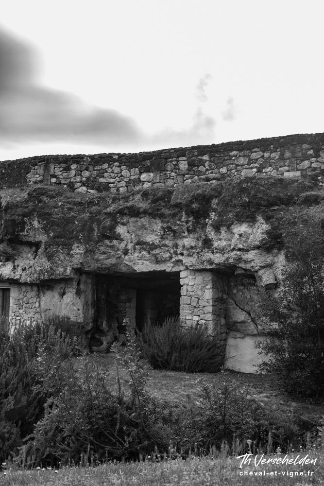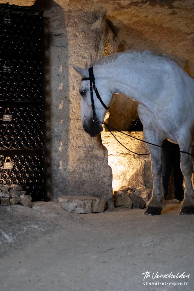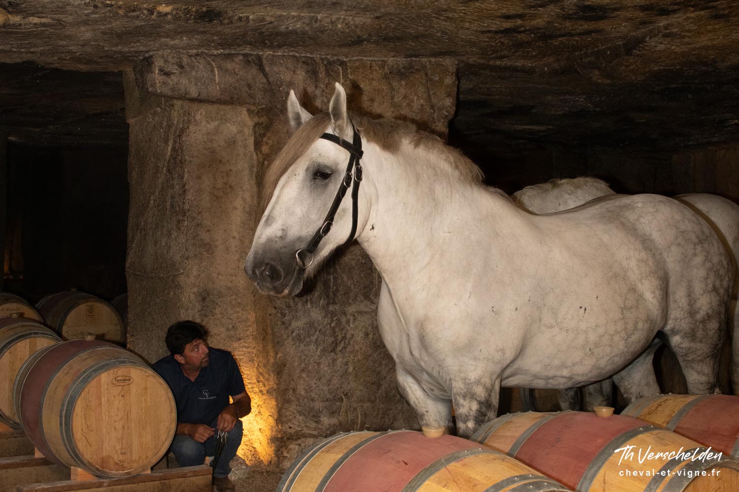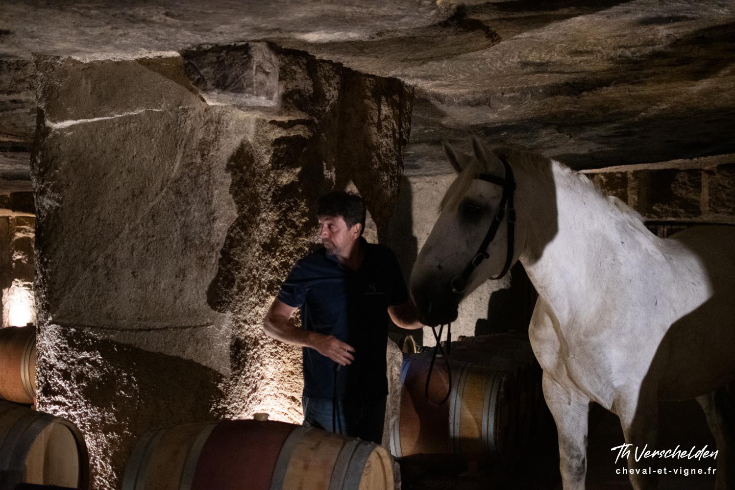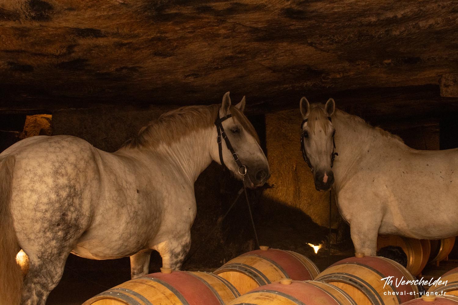 Face au château, dans les entrailles de la colline, le troglodytique chai à barriques (et amphores) a servi de décor à une séance photo de Franck Simon (GraindePixel) commencée dans le cuvier du château Canon et terminée entre les machines avec le personnel qui partage habituellement les rangs avec les chevaux.