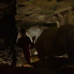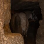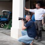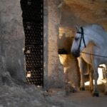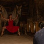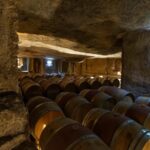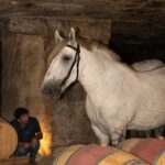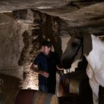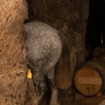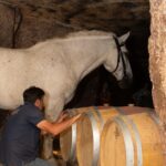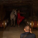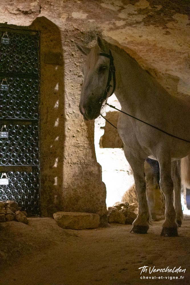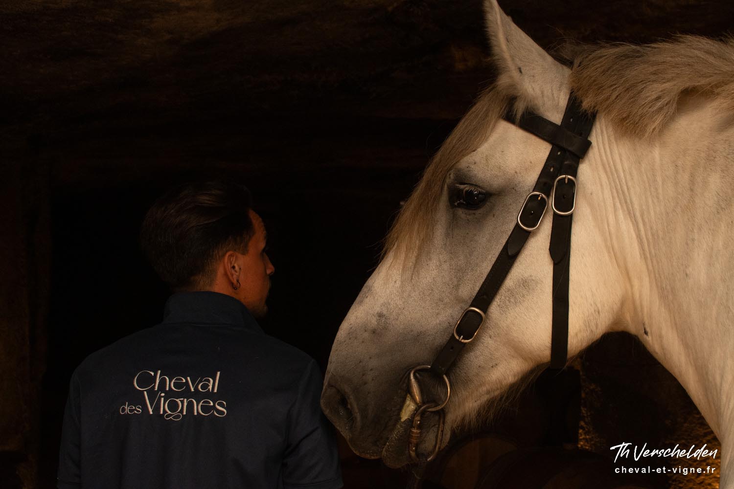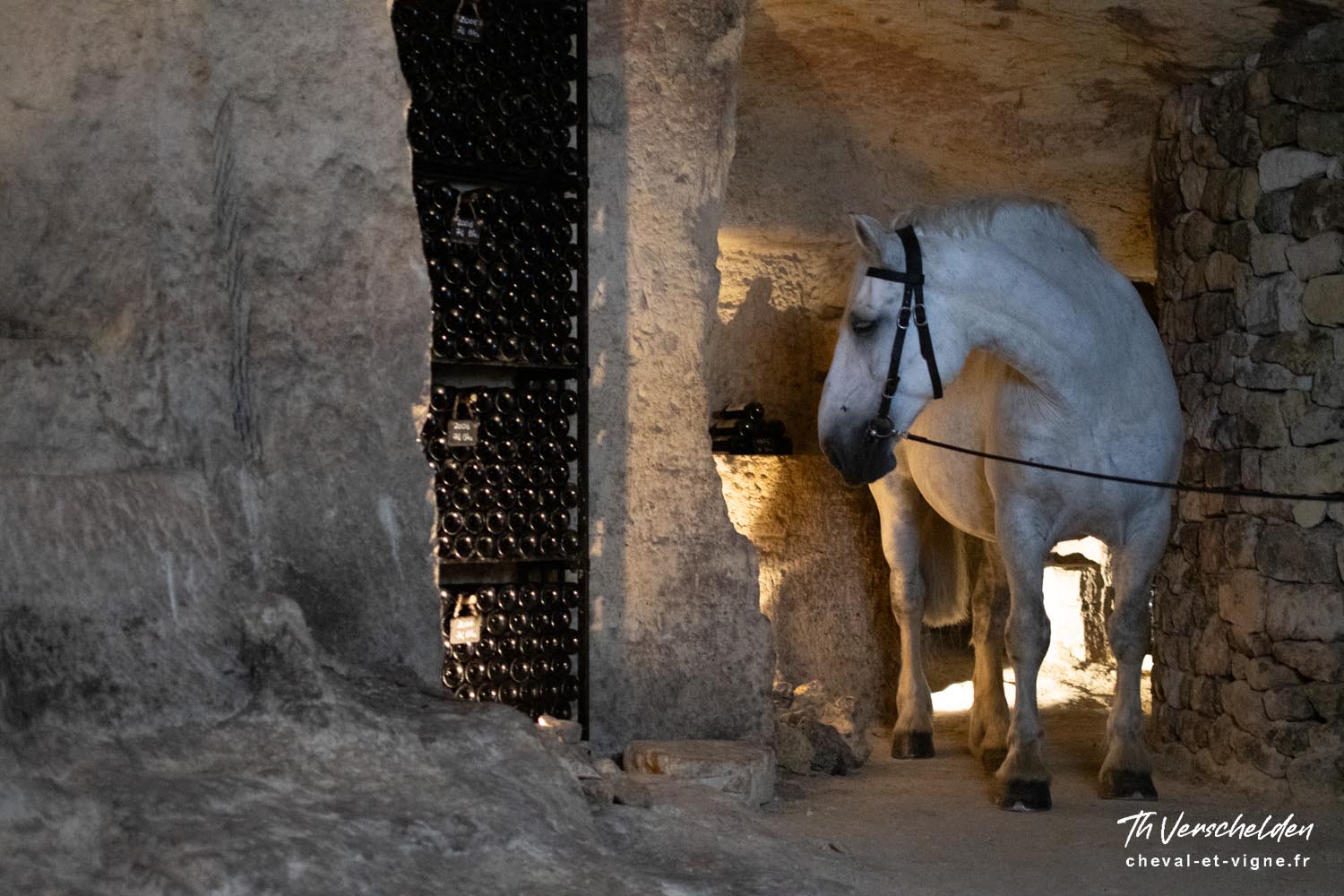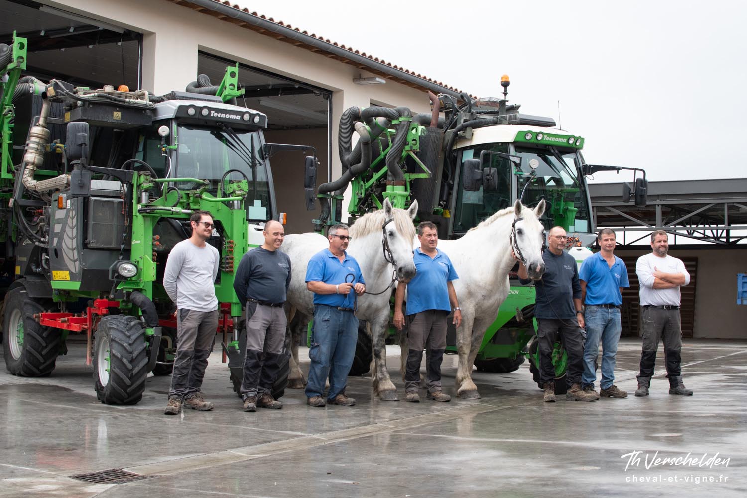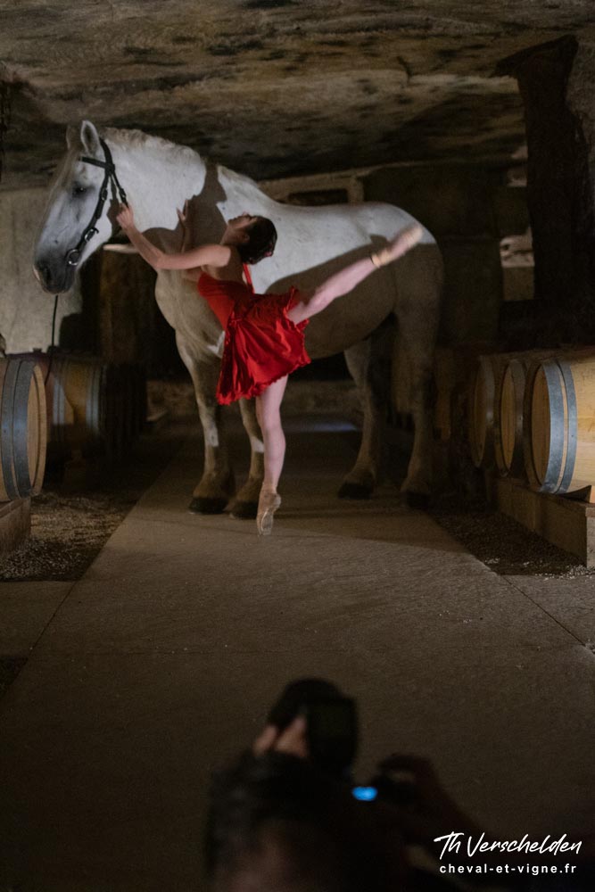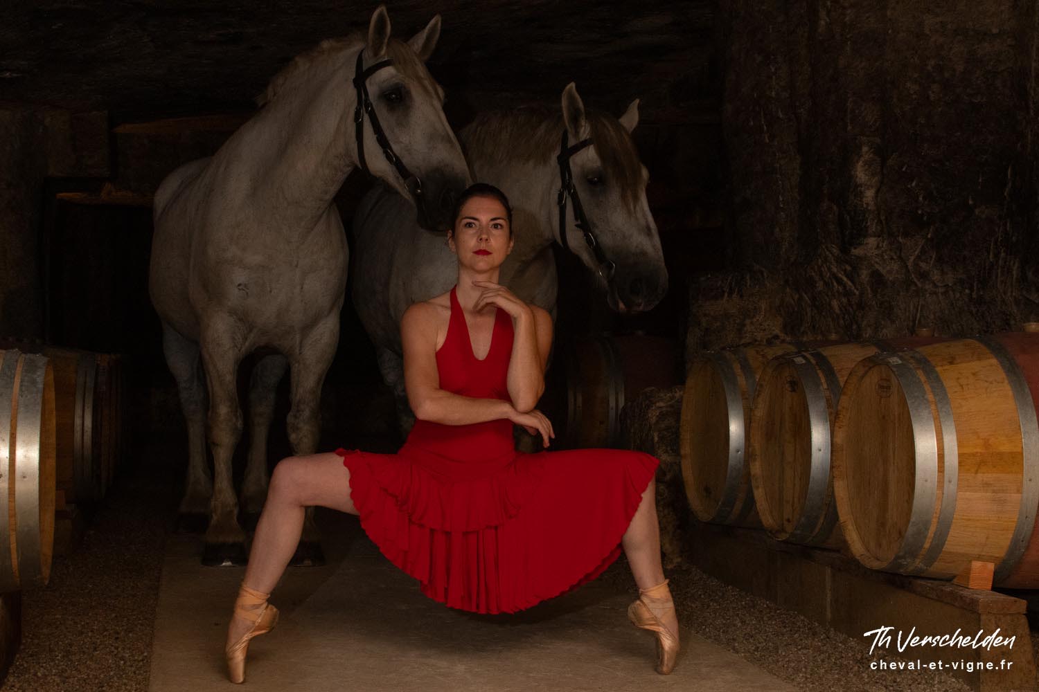 Face au château, dans les entrailles de la colline, le troglodytique chai à barriques (et amphores) a servi de décor à une séance photo de Franck Simon (GraindePixel) commencée dans le cuvier du château Canon et terminée entre les machines avec le personnel qui partage habituellement les rangs avec les chevaux.